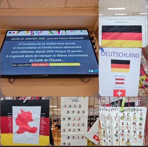 En amont de la Journée franco-allemande du 22 janvier 2026, les élèves germanistes du collège ont conçu et mis en scène une exposition à la médiathèque scolaire afin de présenter à l’ensemble de la communauté éducative les travaux réalisés en cours d’allemand avec Frau Thomas.