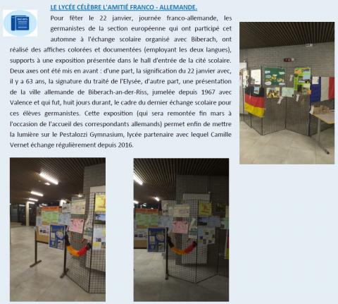 À l’occasion de la Journée franco-allemande du 22 janvier, le lycée Camille Vernet de Valence et sa section européenne allemand ont mis en avant l’amitié franco-allemande à travers une exposition réalisée par les élèves. Cette action s’inscrit dans le prolongement des échanges scolaires réguliers menés avec l’Allemagne depuis une dizaine d’années.